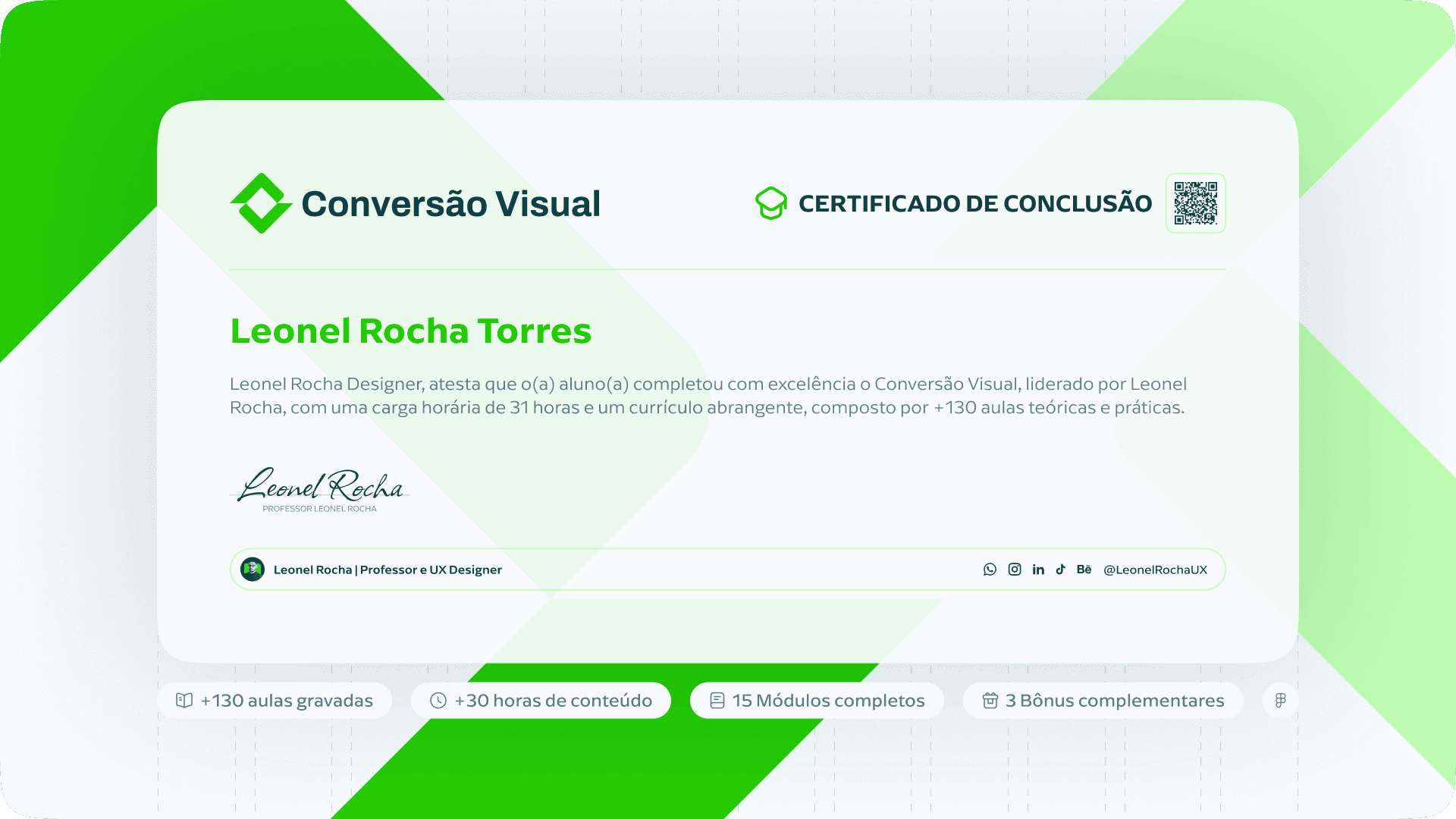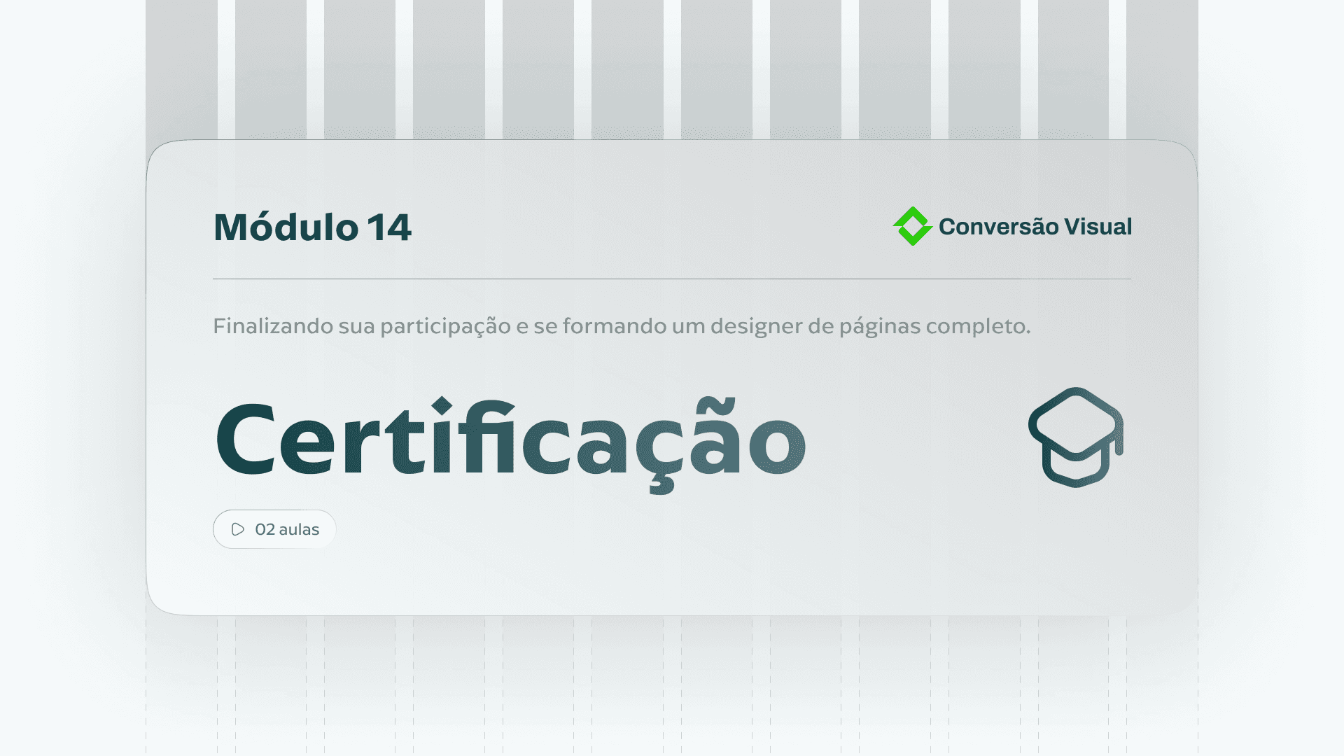 Ao concluir o Conversão Visual, você recebe um certificado de conclusão que comprova sua formação em criação de páginas com foco em conversão — ideal para incluir no portfólio, propostas e LinkedIn.