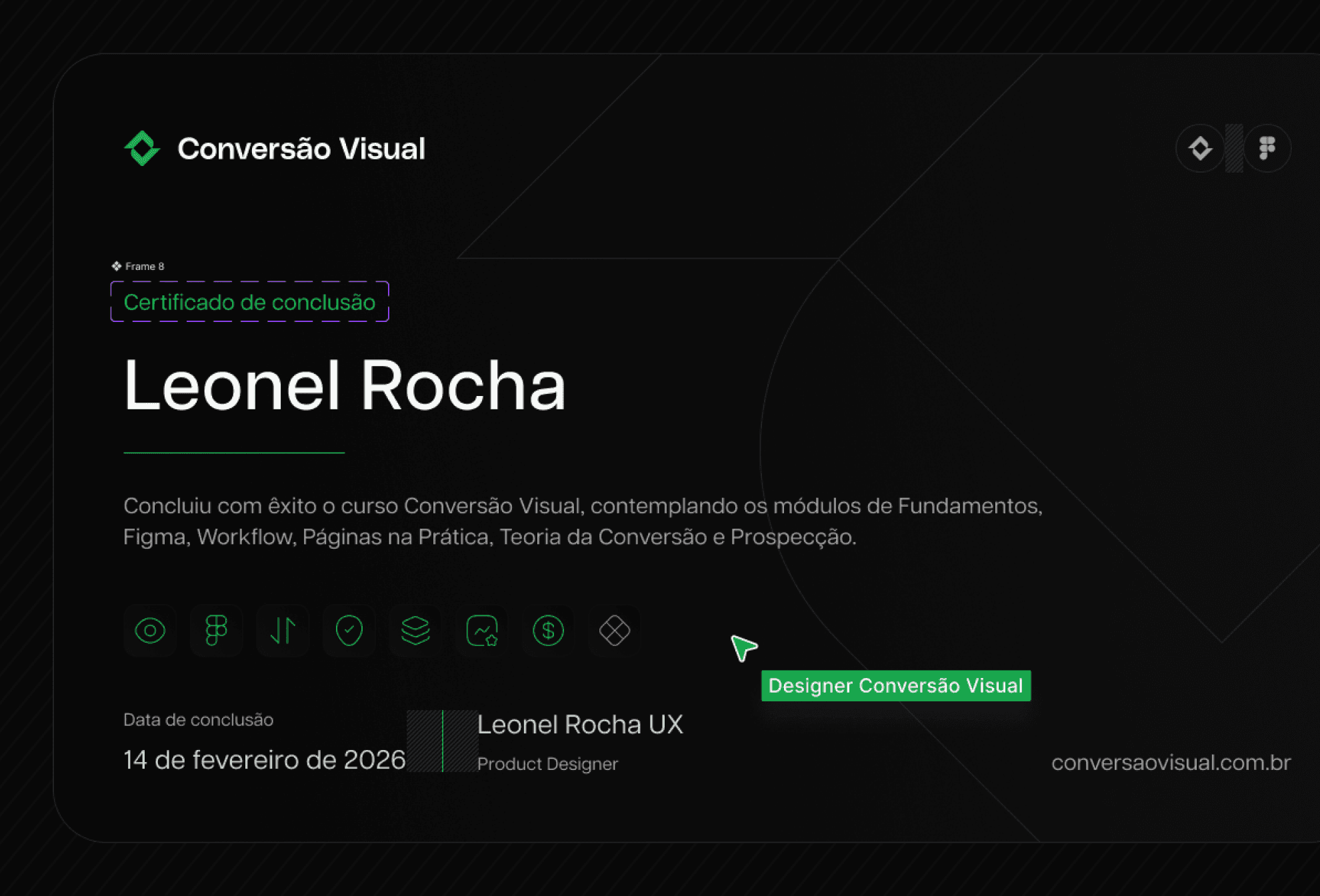 Designer de interfaces há mais de 10 anos. Já entreguei mais de 600 projetos em 12 países. O Conversão Visual é o processo que uso no meu estúdio, organizado em aulas pra você aplicar nos seus projetos.
